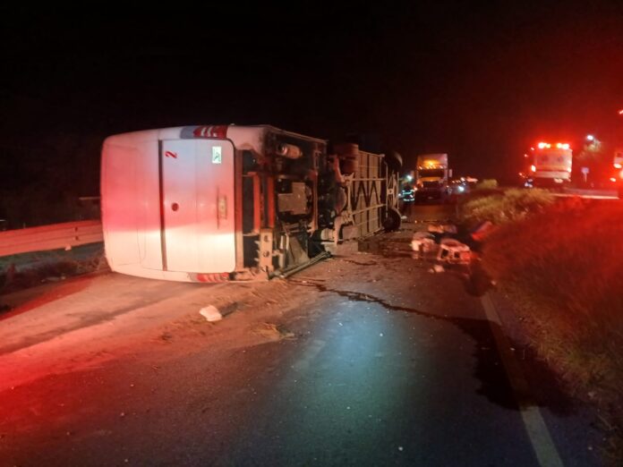 Un saldo de 11 personas muertas y 17 heridas dejó la volcadura de un autobús de turismo en el municipio de Hualahuises, Nuevo León.