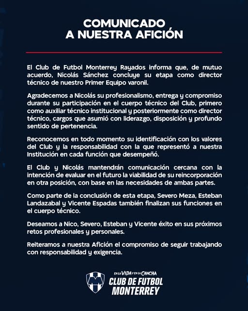 Nuevo León.- Mediante un comunicado el Club de Futbol Monterrey informó sobre la salida de Nicolás Sánchez como director técnico interino, luego de un acuerdo entre ambas partes que pone fin a su etapa al frente del plantel.