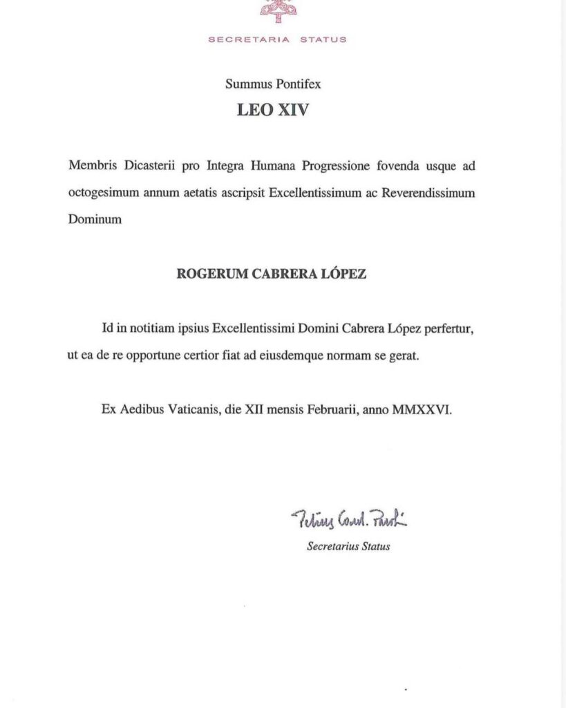 En el texto oficial se indica: “El Sumo Pontífice León XIV ha nombrado del Dicasterio para la Promoción del Desarrollo Humano Integral hasta los ochenta años de edad al Excelentísimo y Reverendísimo Señor Rogelio Cabrera López”.