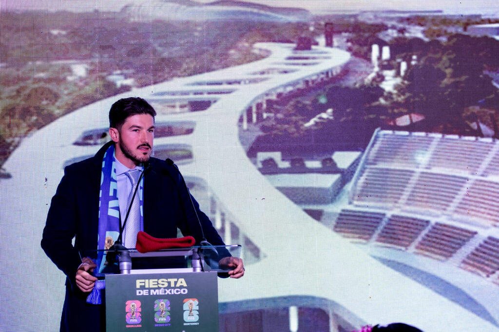 “Empezamos con estas líneas del metro, el monorriel más largo del continente, lo estamos construyendo, va a estar listo para el mundial para que puedan moverse desde el aeropuerto hasta el Fan Fest y hasta el estadio de los Rayados… Estamos construyendo lo que va a ser la torre más grande de América Latina, la torre Rise en el piso 100 va a tener un mirador… estamos renovando toda nuestra flota de autobuses, 4000 nuevos camiones”, detalló García Sepúlveda.