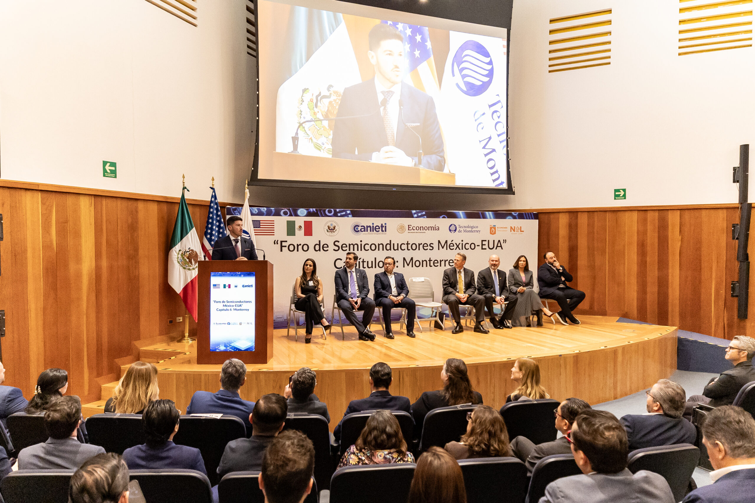 El evento se realizó en la EGADE Business School del Tecnológico de Monterrey, donde el gobernador Samuel García Sepúlveda destacó que la entidad cuenta con condiciones favorables para atraer inversiones relacionadas con la fabricación de semiconductores, entre ellas infraestructura energética, disponibilidad de agua, talento especializado y una base industrial consolidada.