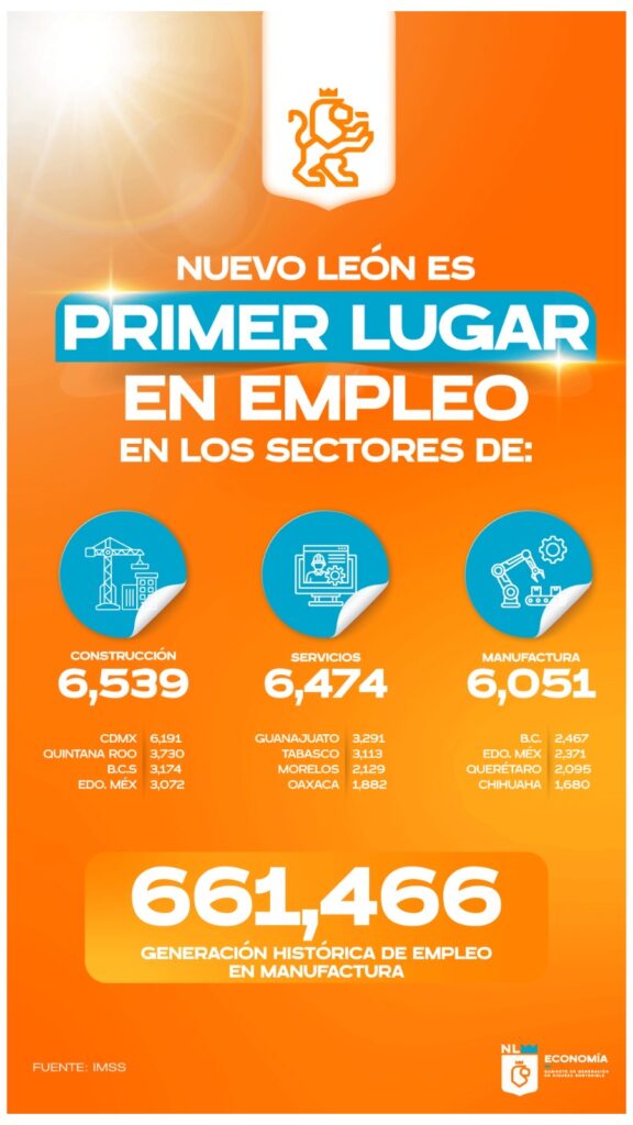 Nuevo León.- Nuevo León se posicionó como primer lugar nacional en generación de empleo durante enero de 2026 en los sectores de Manufactura, Construcción y Servicios.