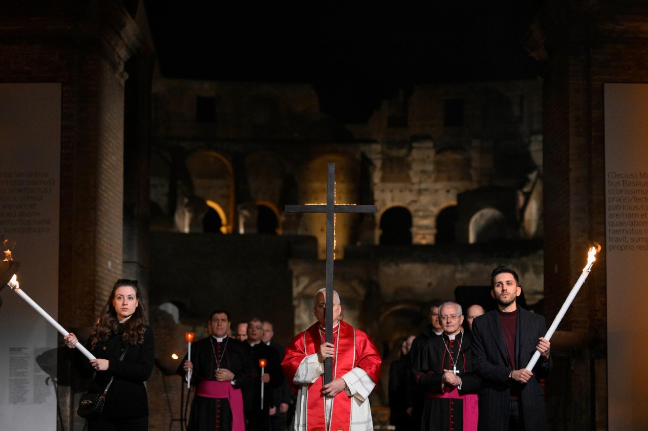 Durante las catorce estaciones del Vía Crucis —que conmemora el camino de Jesucristo hacia la crucifixión—, se leyeron meditaciones elaboradas por el religioso Francesco Patton.
