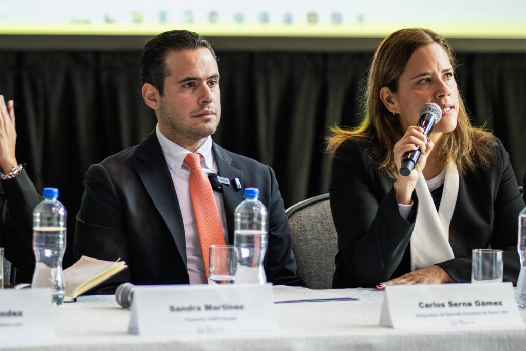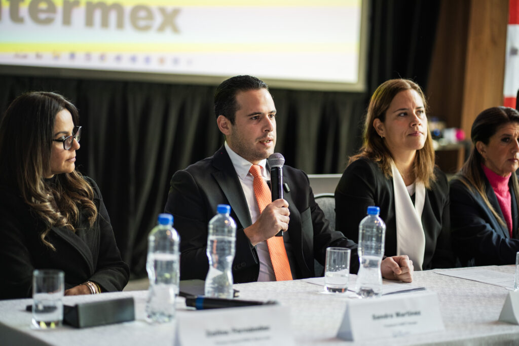 En la rueda de prensa también estuvieron presentes Sandra Martínez, Directora de CANIETI; Jesús Francisco López, Director de Relaciones Institucionales de CAINTRA; Zelina Fernández, Directora de INDEX; Ricardo Apaez, del Clúster Automotriz; y Jorge Gámez, Director de Cadenas Productivas de la Secretaría de Economía de Nuevo León.