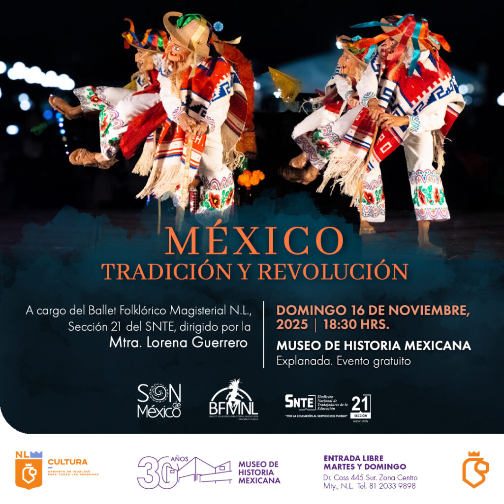 Nuevo León.- El Museo de Historia Mexicana se llena de color, música y orgullo nacional con la presentación del Ballet Folklórico Magisterial Nuevo León, Sección 21 del SNTE, bajo la dirección de la Mtra. Lorena Guerrero, con el espectáculo “México: Tradición y Revolución”, una celebración profunda y luminosa del nacionalismo mexicano, el domingo 16 de noviembre, a las 18:30 horas en la explanada del museo.