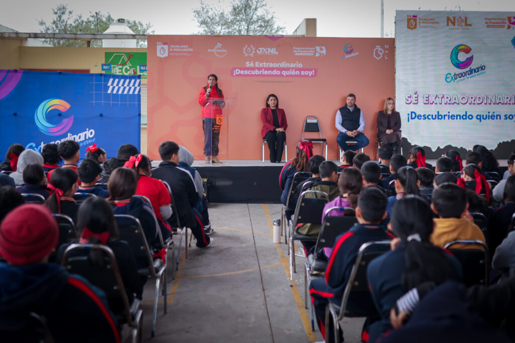 Durante su mensaje en la Sexta Jornada del programa “Sé Extraordinario”, realizada en la Escuela Secundaria No. 2 “Prof. Gustavo Garza Guajardo”, en El Carmen, la titular de la Secretaría de Igualdad e Inclusión, Martha Herrera, destacó el trabajo colaborativo con Red Familia A.C. para seguir impulsando acciones a favor de las juventudes de Nuevo León.