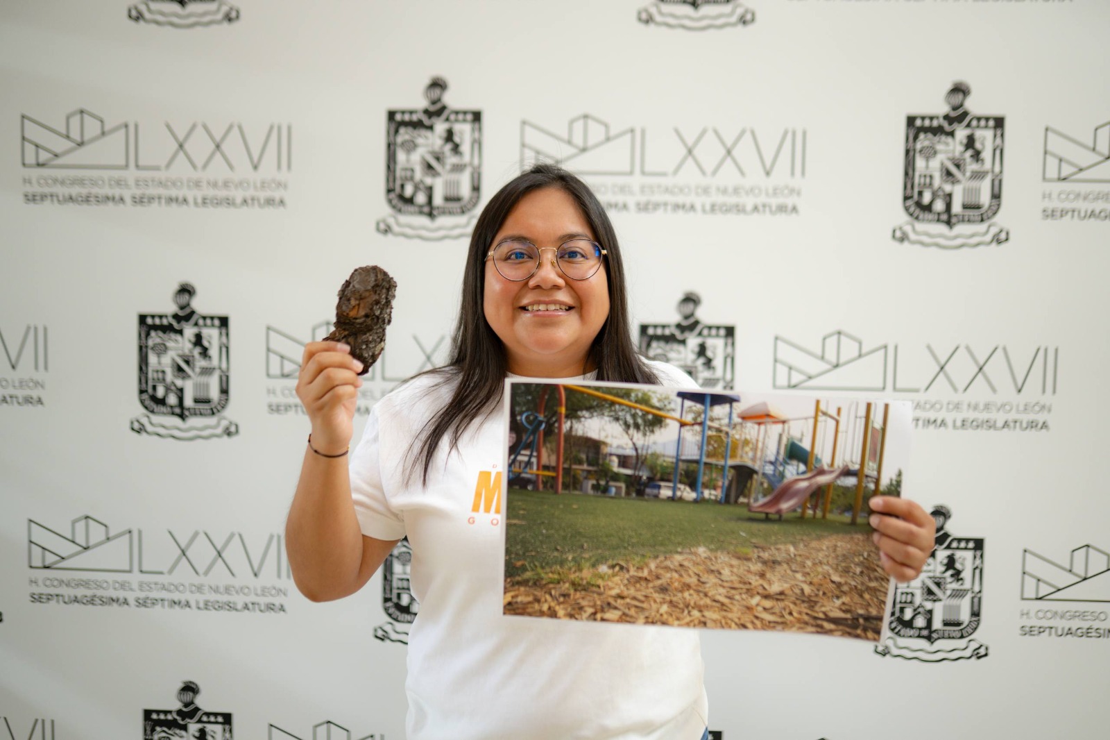 Para evidenciar esta situación, la legisladora presentó imágenes de varios parques del municipio y mostró un fragmento de tronco natural debidamente tratado, extraído de un parque en San Pedro Garza García, diseñado específicamente para áreas infantiles.