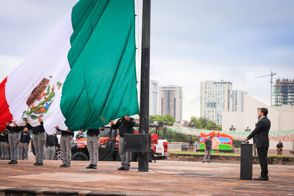 Acompañado del Secretario General de Gobierno, Miguel Ángel Flores Serna y del director de Protección Civil, Erik Cavazos, el Mandatario estatal condujo el acto cívico de honores e izamiento de Bandera a media asta en la Explanada de los Héroes.