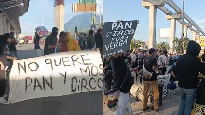 La protesta se llevó a cabo sobre la Avenida Francisco I. Madero, frente a la puerta 5 del parque, donde los manifestantes desplegaron pancartas y corearon consignas como “no queremos pan y circo”, en alusión directa al evento gratuito encabezado por el Gobernador Samuel García.
