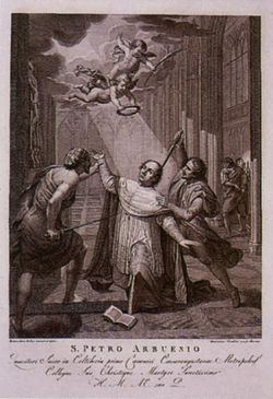 San Pedro Arbués. Fue un presbítero agustino español e inquisidor del reino de Aragón, asesinado por un grupo de judeoconversos, en la Seo de Zaragoza que fueron los únicos condenados.