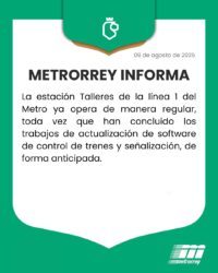 Nuevo León.-Los trabajos de actualización del software en la estación Talleres de la línea 1 del metro concluyeron de manera éxitosa y antes del tiempo esperado por lo que las autoridades de Metrorrey reabrieron esta línea, que ya continúa con su operación regular durante el fin de semana.