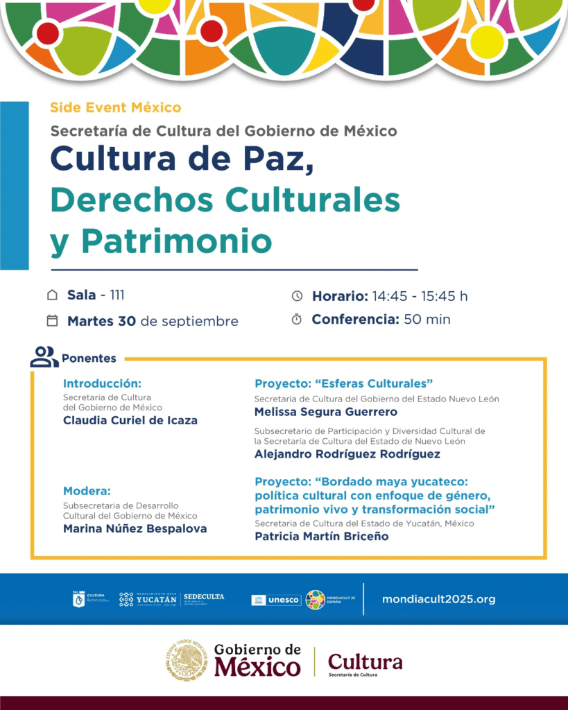 Por ello, el segundo día, en la Sala de Lanzamiento, organizada por la Unesco y el Ministerio de Cultura Español, en la conferencia «Cultura de Paz, Derechos Culturales y Patrimonio» participarán la titular de Cultura de Nuevo León, Melissa Segura Guerrero, con el modelo de «Esferas Culturales», y la secretaria de Cultura de Yucatán, Patricia Martín Briceño, con el modelo de «Bordado maya yucateco: política cultural con enfoque de género, patrimonio vivo y transformación social».