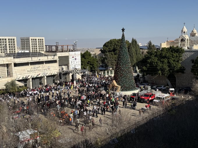 En la plaza un árbol de Navidad gigante, cubierto con esferas rojas y doradas, brilla junto a la Iglesia de la Natividad, que fue construida sobre una gruta en donde se cree que nació Jesus hace más de 2 mil años.