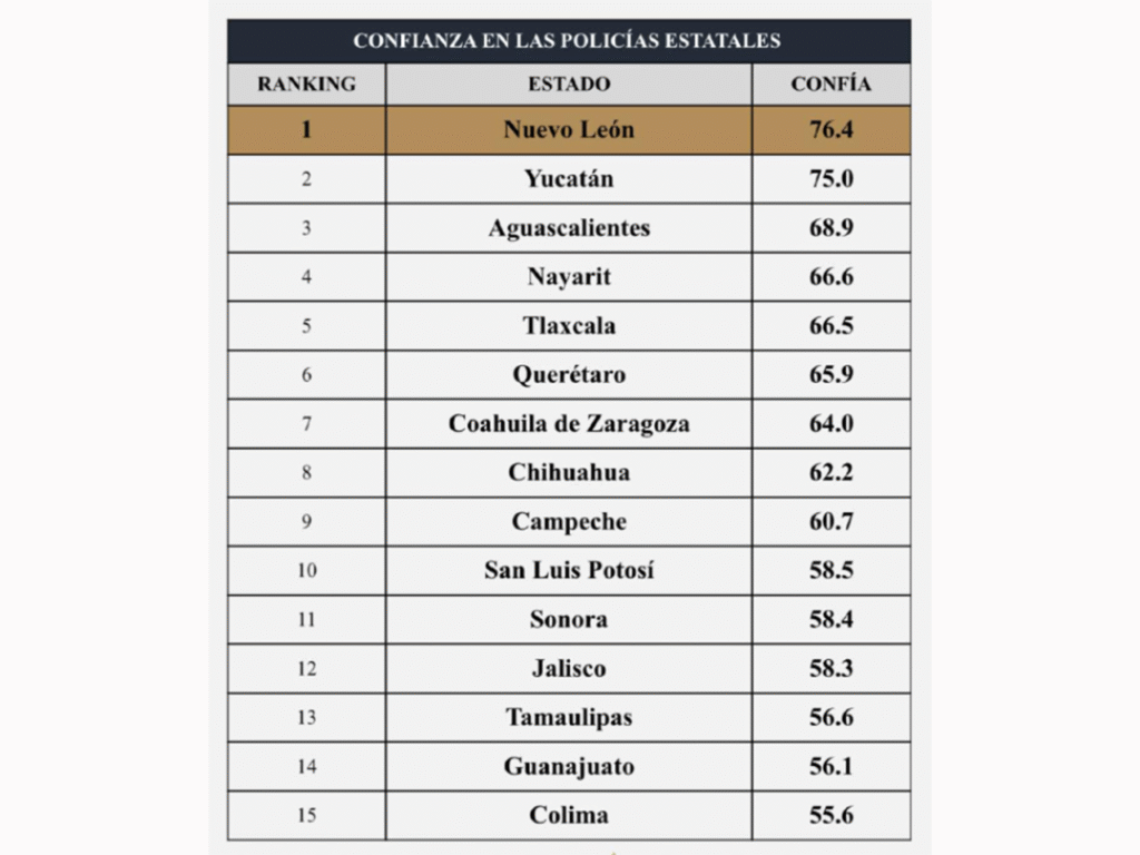 Esta es la tercera edición consecutiva de la encuesta en la que Fuerza Civil se mantiene como la policía estatal con mayor confianza ciudadana del país, tomando el promedio de los municipios evaluados en cada entidad federativa.