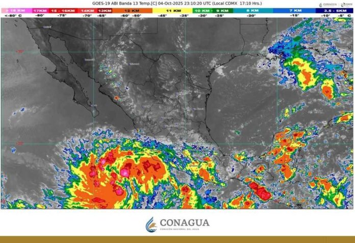 Se localiza a 460 kilómetros al sur-suroeste de Manzanillo, Colima, tiene vientos sostenidos de 75 kilómetros por hora y rachas de 95 km/h, se mueve hacia el noroeste a una velocidad de 11 km/h.