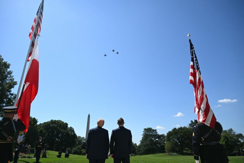 Los líderes presenciaron el sobrevuelo de dos aviones cazas realizado en honor al piloto polaco que falleció en combate, honores sin presedentes en Washington; representa un símbolo de la relación especial entre los dos países.