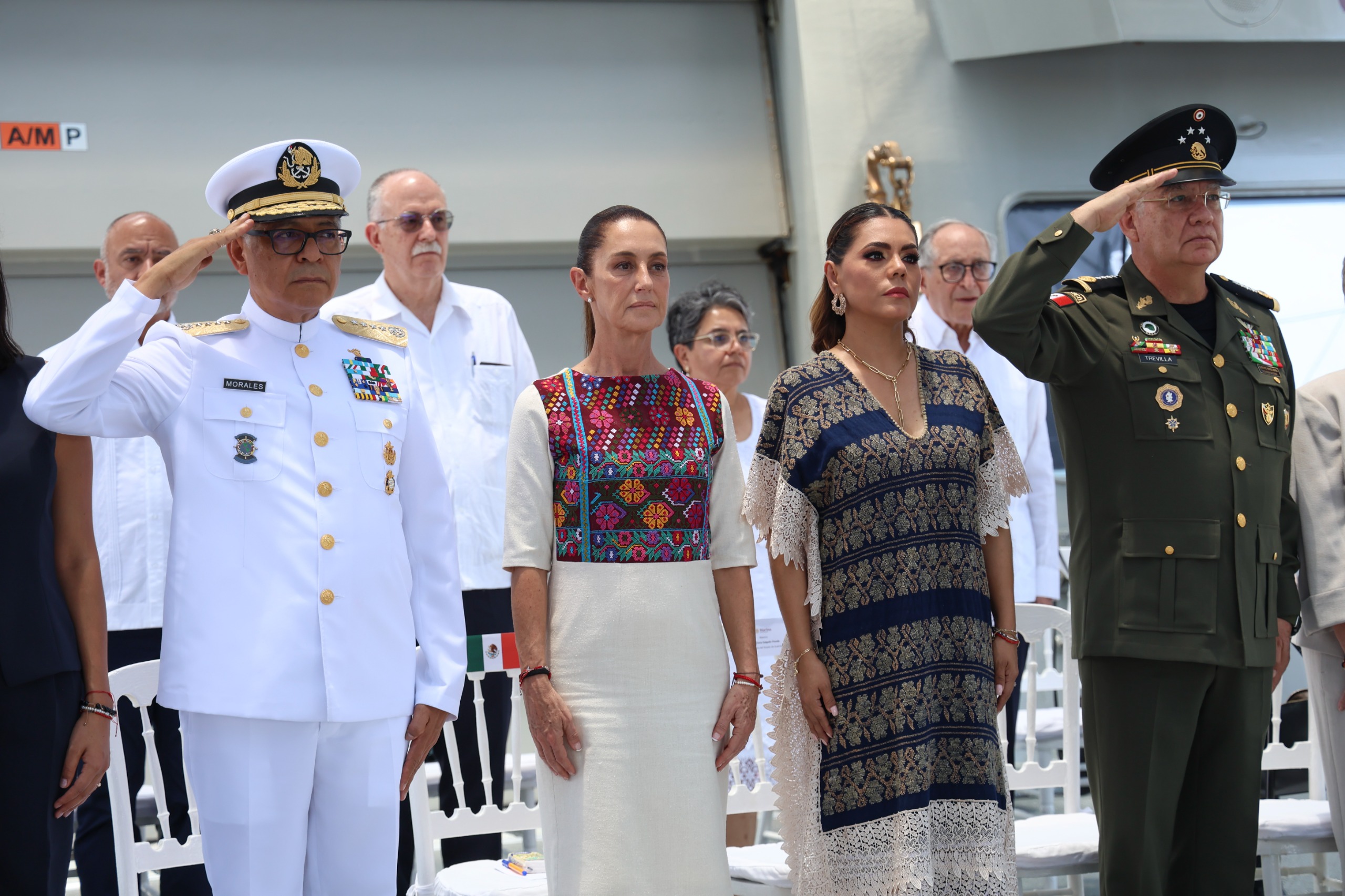 La ceremonia también sirvió para reconocer el papel de la Secretaría de Marina en proyectos estratégicos como el Corredor Interoceánico del Istmo de Tehuantepec, la ampliación de puertos clave y la construcción de más de 180 mil viviendas para personas en situación de pobreza.