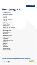 Las colonias que se verán afectadas por la falta del vital líquido serán: Benito Juárez, Bernardo Reyes, Central, Centro, 10 de Marzo, Estrella, Ferrocarriles, Garza Nieto, Industrial, Jardín de las Mitras, y Leones, además de Mitras Norte, Mitras Centro, Morelos, Nueva Morelos, Pedro Lozano, Progreso, Rubén Jaramillo, San José, Talleres, Tijerina, Urdiales, María Luisa, y Valle Morelos.
