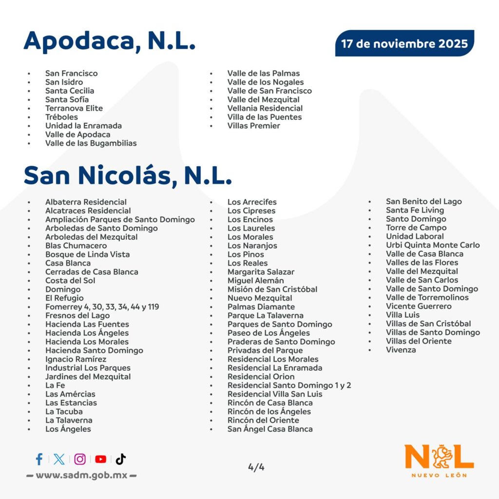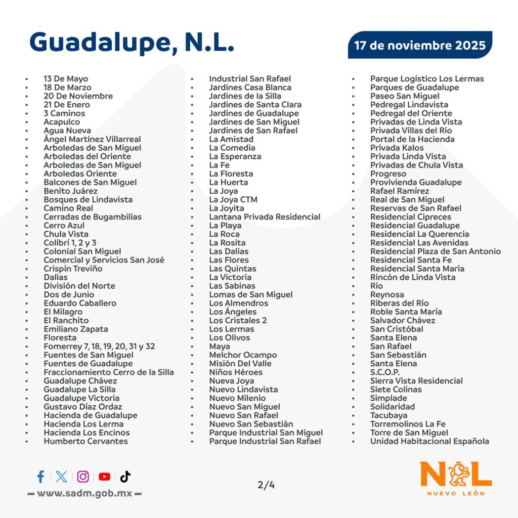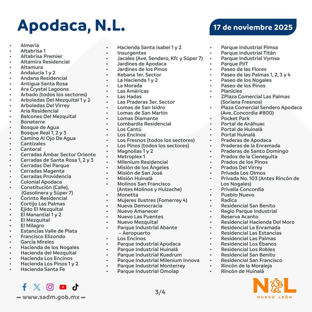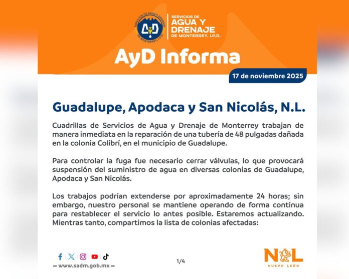 Esta reparación requerrirá el cierre de válvulas y afectará con la falta de vital líquido en colonias de los municipios de Guadalupe, Apodaca y San Nicolás.