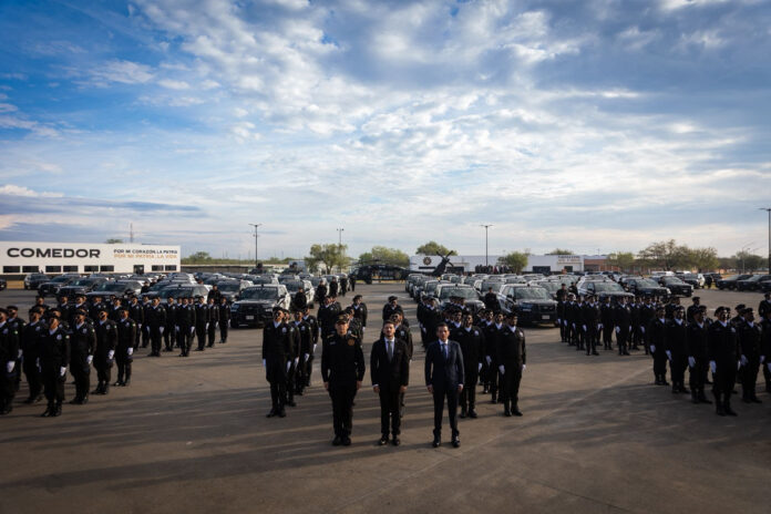 Nuevo León.- Siguiendo con el fortalecimiento de la Seguridad en el Estado, el Gobernador de Nuevo León, Samuel Alejandro García Sepúlveda tomó protesta a 200 nuevos policías que se integran a Fuerza Civil, cifra con la que se alcanzan 6 mil 800 policías y el Estado se encamina a cumplir su meta sexenal de 7 mil elementos un año antes, rumbo al Mundial 2026.