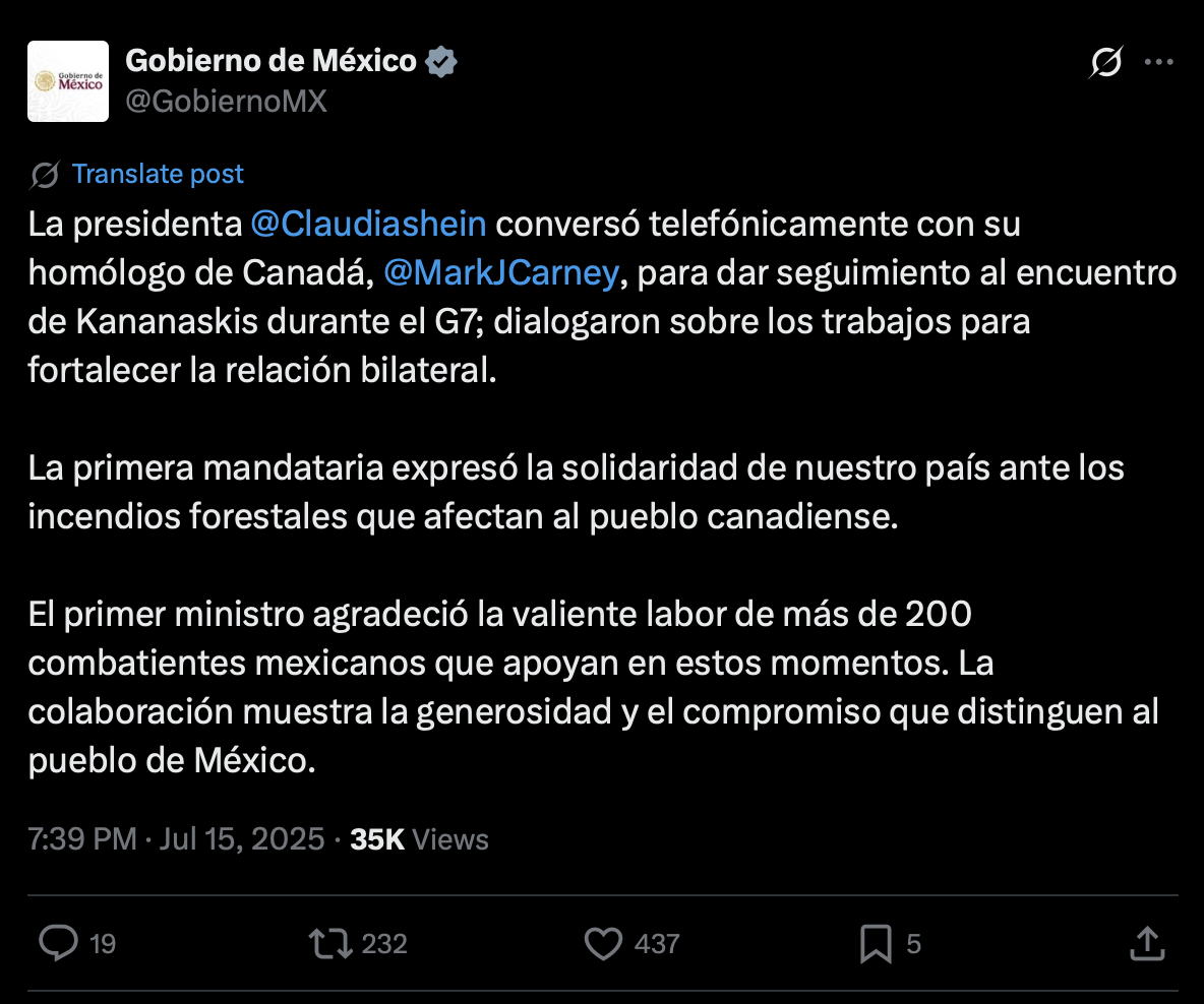 “Ambos coincidimos en que el acuerdo comercial entre EU, Canadá y México debe respetarse, y compartimos nuestras experiencias respecto a la carta que recibimos del presidente Trump”, afirmó la Presidenta durante la Mañanera del Pueblo.