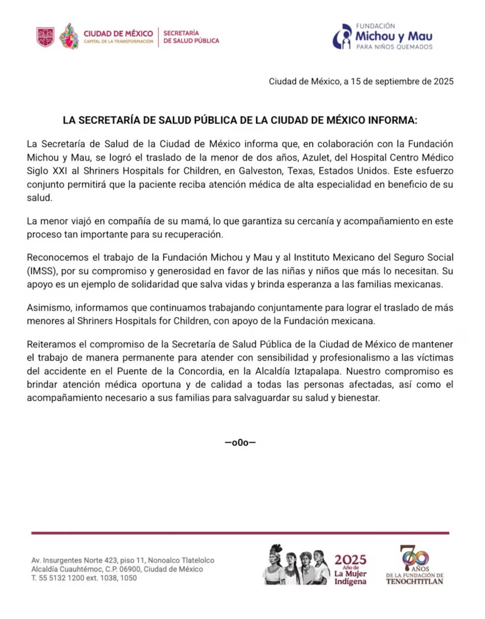 Por su parte, la Fundación Michou y Mau informó que la paciente será atendida en el hospital especializado de Galveston. La organización agradeció el apoyo del Centro Médico Nacional Siglo XXI, así como de autoridades federales y locales, para concretar la valoración y el traslado de la menor.