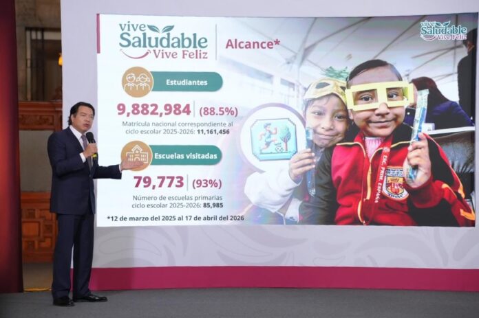 México.- El secretario de Educación Pública, Mario Delgado, destacó que con la estrategia Vive saludable, vive feliz, que inició el 12 de marzo de 2025, se ha valorado la salud de 9.8 millones de estudiantes de primaria, lo que representa 88.5 por ciento, además se han visitado 79 mil 773 escuelas, 93 por ciento. Agregó que en ocho entidades ya se visitó el 100 por ciento de las escuelas; en siete estados se tiene un avance del 80 por ciento; en cinco de entre 79 y 66 por ciento; en tres del 65 por ciento; y en nueve entidades ya se realizan una segunda visita.
